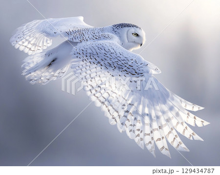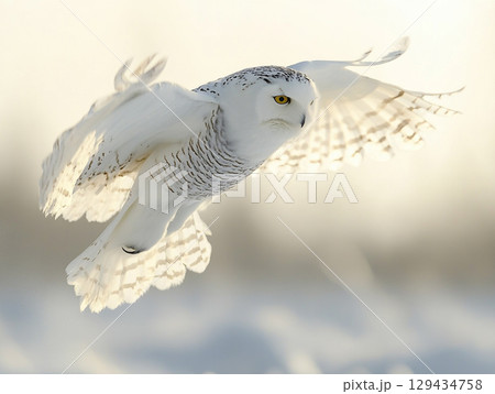 A magnificent snowy owl glides through a snowstorm, its powerful wings spread wide. Its piercing yellow eyes stare ahead.