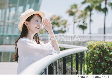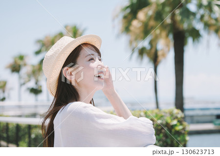 白い水着と帽子の女性の後ろ姿|青空と海が広がる夏のビーチシーン