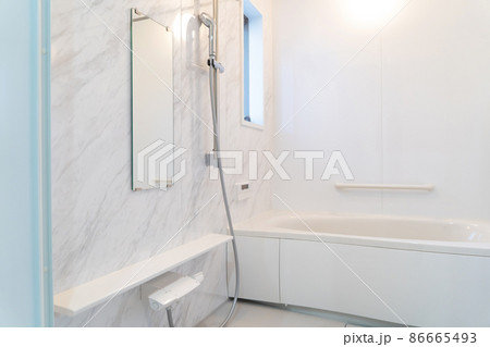 風呂場の水垢 風呂の鏡、棚に白い水垢が沢山ついている