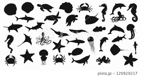Collection of black set silhouettes of fish, seahorse, shells, octopuses, dolphins, sharks, whales, crabs and stingrays on a white background. Vector clipart