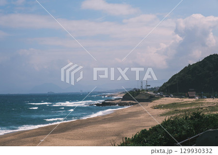 「因幡の白兎」の舞台とされる白兎海岸(鳥取県鳥取市)の砂浜と、夏の青い日本海と国道9号の風景。