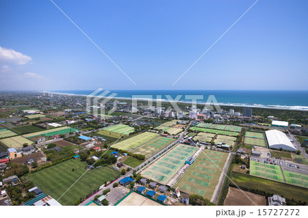 海とたくさんのテニスコートの見える九十九里白子町付近を空撮