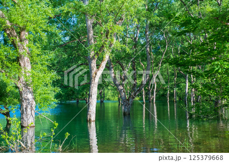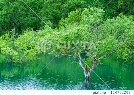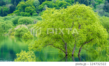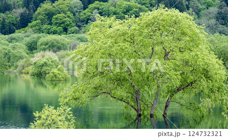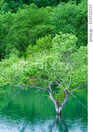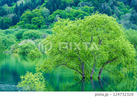新緑の「白川湖の水没林」(山形県飯豊町、4月下旬)