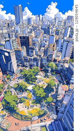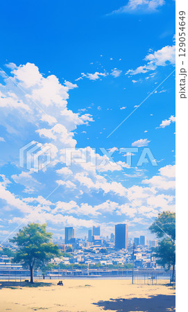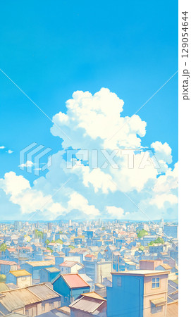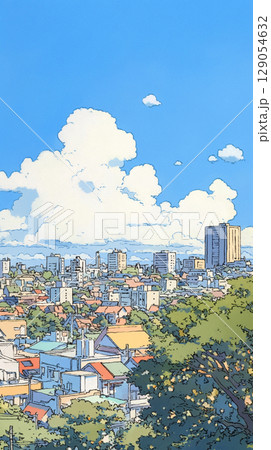 遠くまで続く街と空をやさしく描いた手描きの風景画。晴れ渡る青空と穏やかな都市の時間が感じられる