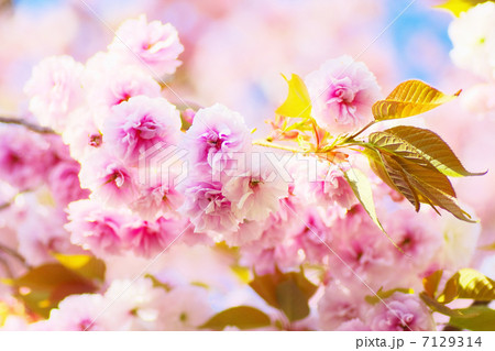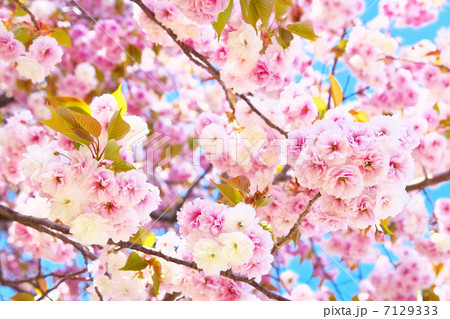 満開の八重桜(普賢象)のクローズアップ 【青空背景】