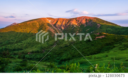 夏 志賀高原渋峠から望む朝陽を浴びる爽やかな白根山と笹原斜面