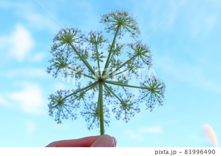 シラネセンキュウ 白い花 指 青空