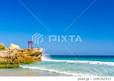 伊豆白浜海岸、青空に浮かぶ赤い鳥居
