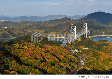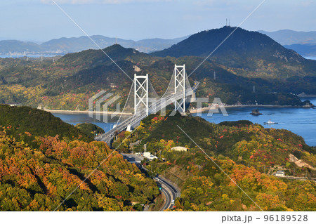 広島県尾道市因島 白滝山からの風景 因島大橋と紅葉の山並み