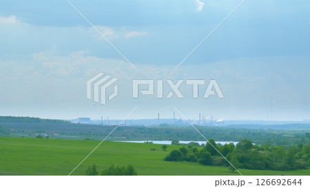 Expansive Lush Green Fields with a Distinct Industrial Background Beneath a Cloudy Sky Time lapse.