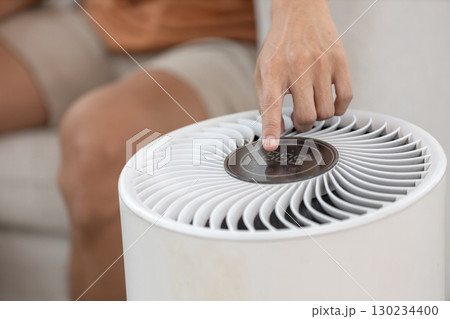 Close up of hand pressing power button air purifier for clean air in house for good health.