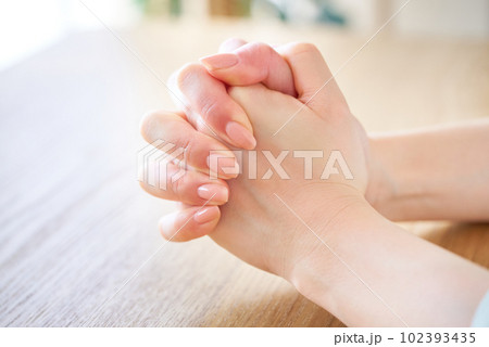 手を組んで考え込む女性の手元