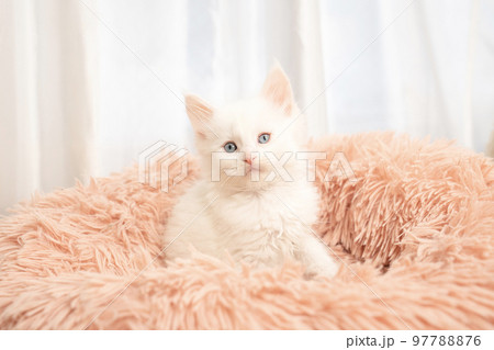フカフカの猫ベッドに入ったメインクーンの白い仔猫
