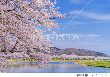 青空と満開の桜 白石川堤一目千本桜 宮城県大河原町
