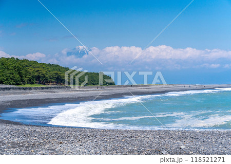 三保松原 日本三大松原と青い海の白波越しに雄大な富士山を望む 世界文化遺産 日本新三景 国の名勝