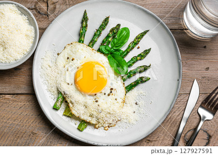 Fried egg with green asparagus and grated parmesan cheese for breakfast