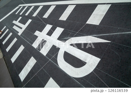 舗装したばかりのチョークの補助線跡が残っている止まれ路面標示