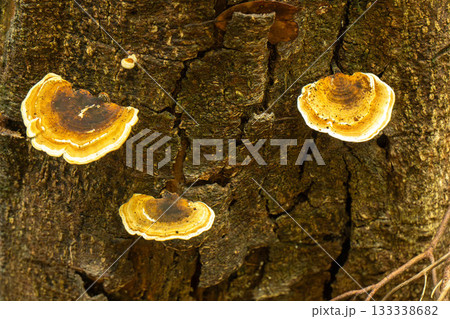 白色腐朽菌ヒイロダケ、カワラタケ群生