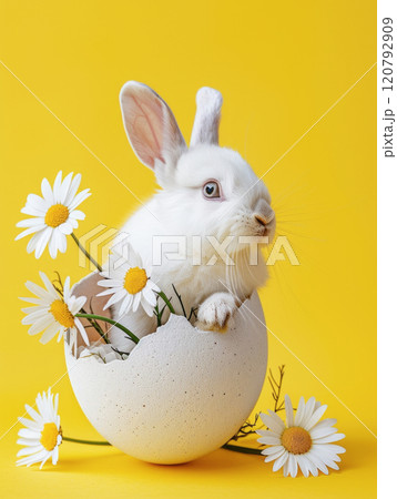 White bunny in an Easter egg with daisy flowers on yellow background. Greetings card, poster, flayer, banner concept