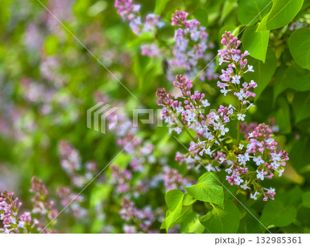 Close up of pink and white lilac blossoms on vibrant green leaves in sunny garden
