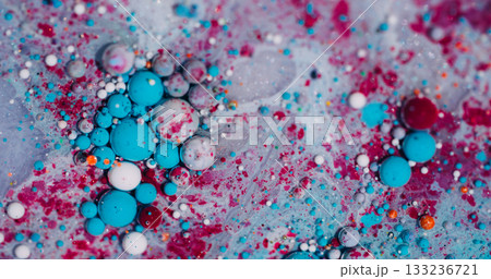 Oil droplet. Liquid background. Blur blue purple white color ink in glitter water round bright texture flow on bokeh art abstraction.