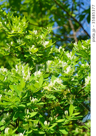自然 植物 キンギンボク、花の色が白から黄色に変化。同じ枝で二色の花を楽しめます