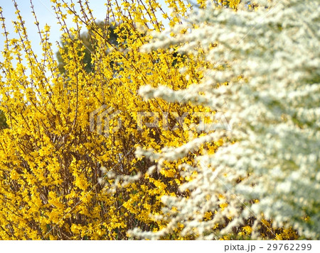 レンギョウとユキヤナギの花のある風景