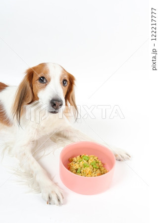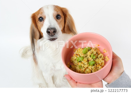ピンクのボウルに入った手作りご飯を前にするコーイケルホンディエ