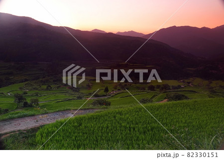 夕暮れの吉延の棚田と集落とオレンジ色に染まる夕焼け空
