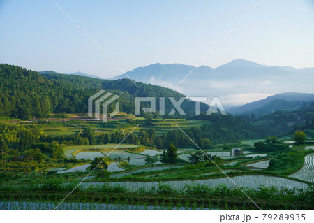 朝靄に包まれた白髪山と棚田