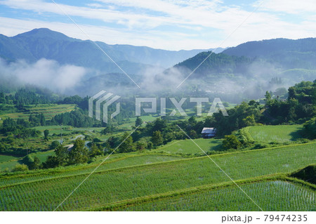 吉延棚田と霧に霞む白髪山