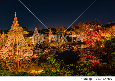 愛知県 名古屋市 白鳥庭園の雪吊り 夕景 紅葉のライトアップ