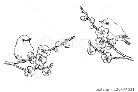 梅の花とメジロの線画