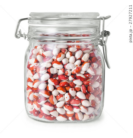 Glass jar full of dried pinto beans on gray closeup. Traditional Latin American legumes