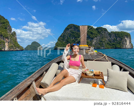 Woman tourist in private longtail boat trip to island with exotic food picnic, Krabi, Thailand. landmark, destination, Asia Travel, vacation, wanderlust and holiday concept