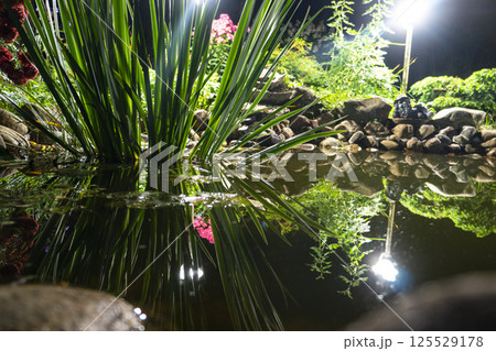 Garden pond at night. Illuminated pond shore in a night. Fish pond. Garden pond on natural landscape. Water garden natural pool. Exterior of a private garden