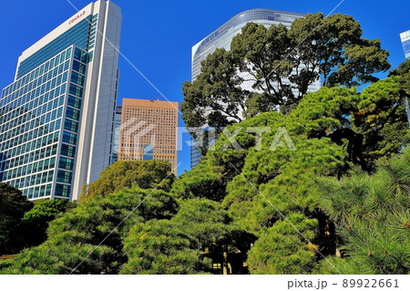 浜離宮庭園の三百年の松と汐留の超高層ビル群