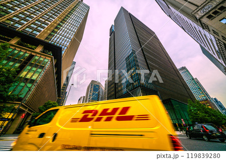 日本の東京都市景観 大手町駅前の交差点。DHLやタクシー…正面は大手町タワー=11月1日