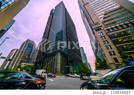 東京都 夜の丸の内、高層ビル群