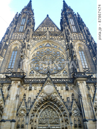 チェコ・プラハ市街地の聖ヴィート大聖堂にて正面外観クローズアップ