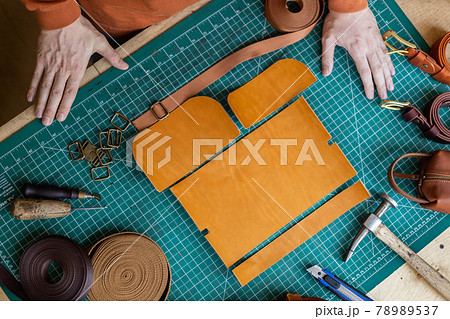 Process cutting scheme of bag with equipment and materials. Male tanner working at leather workshop