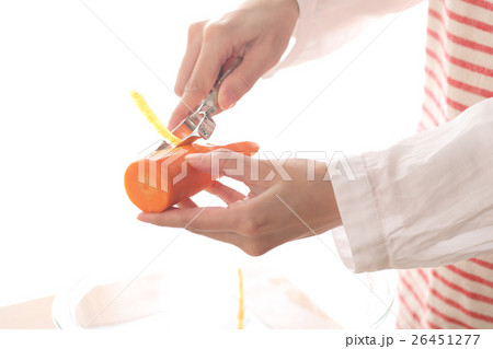 キッチンで人参の皮をピーラーで剥く女性 顔無し