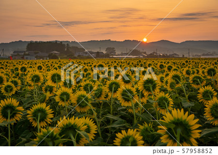 栃木県芳賀郡益子町上山地区 ましこ町ひまわり祭りの会場の満開のヒマワリ畑と夕陽と夕焼け空