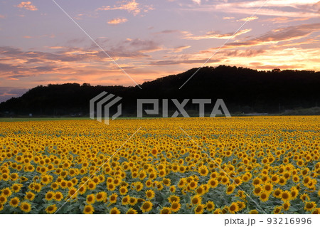 栃木県芳賀郡益子町上山地区 ましこ町ひまわり祭りの会場の満開のヒマワリ畑と夕焼け空