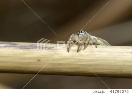 生き物 蜘蛛 クモマハエトリ、オスです。四月、千葉県下の自然公園。林縁の遊歩道で