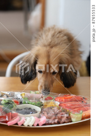 机の上のオードブルを狙うハイシニアのミニチュアダックス