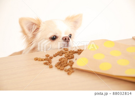 机の上のドッグフードを盗み食いするクリーム色のロングコートチワワ