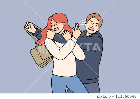 Man robber is sprayed with gas from victim spray bottle, using pepper spray for self-defense