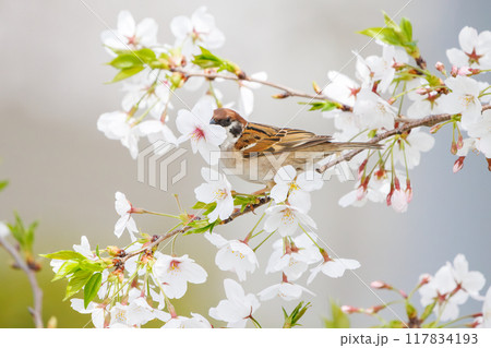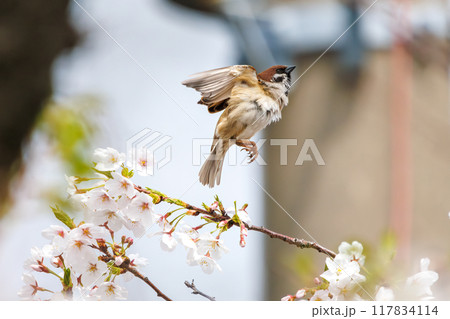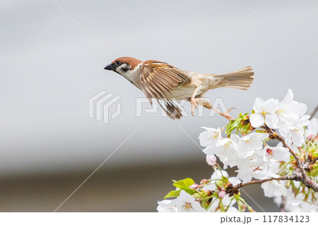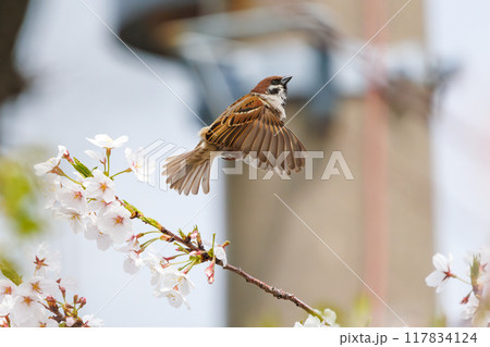 美しいソメイヨシノ(桜)の間を飛び回り盗蜜する可愛いスズメ(スズメ科) 横浜市鶴見区、矢向一丁目公園
