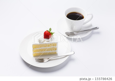 皿に盛られたケーキとコーヒー ショートケーキ 白背景